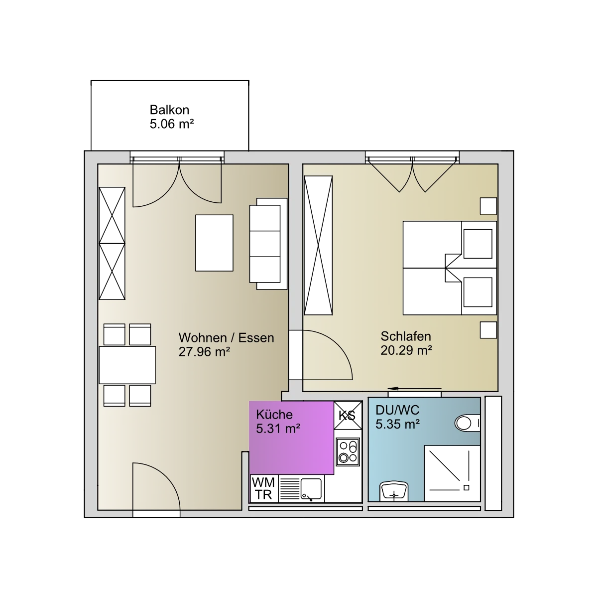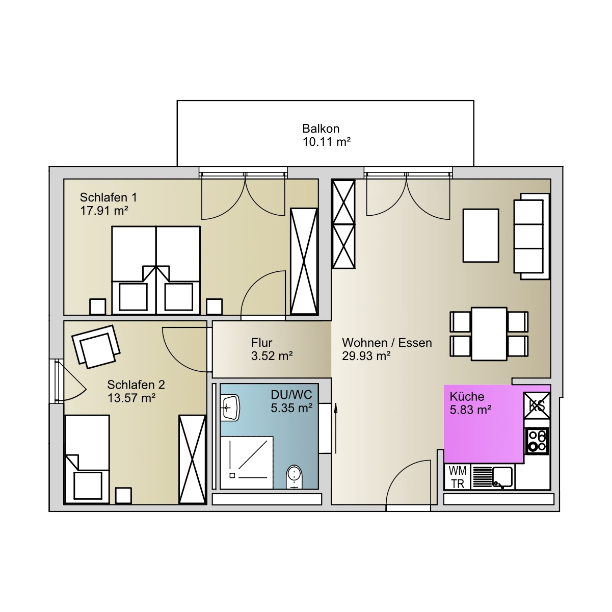 Großzügige Raumaufteilung für Wohn-, Essbereich und Schlafzimmer