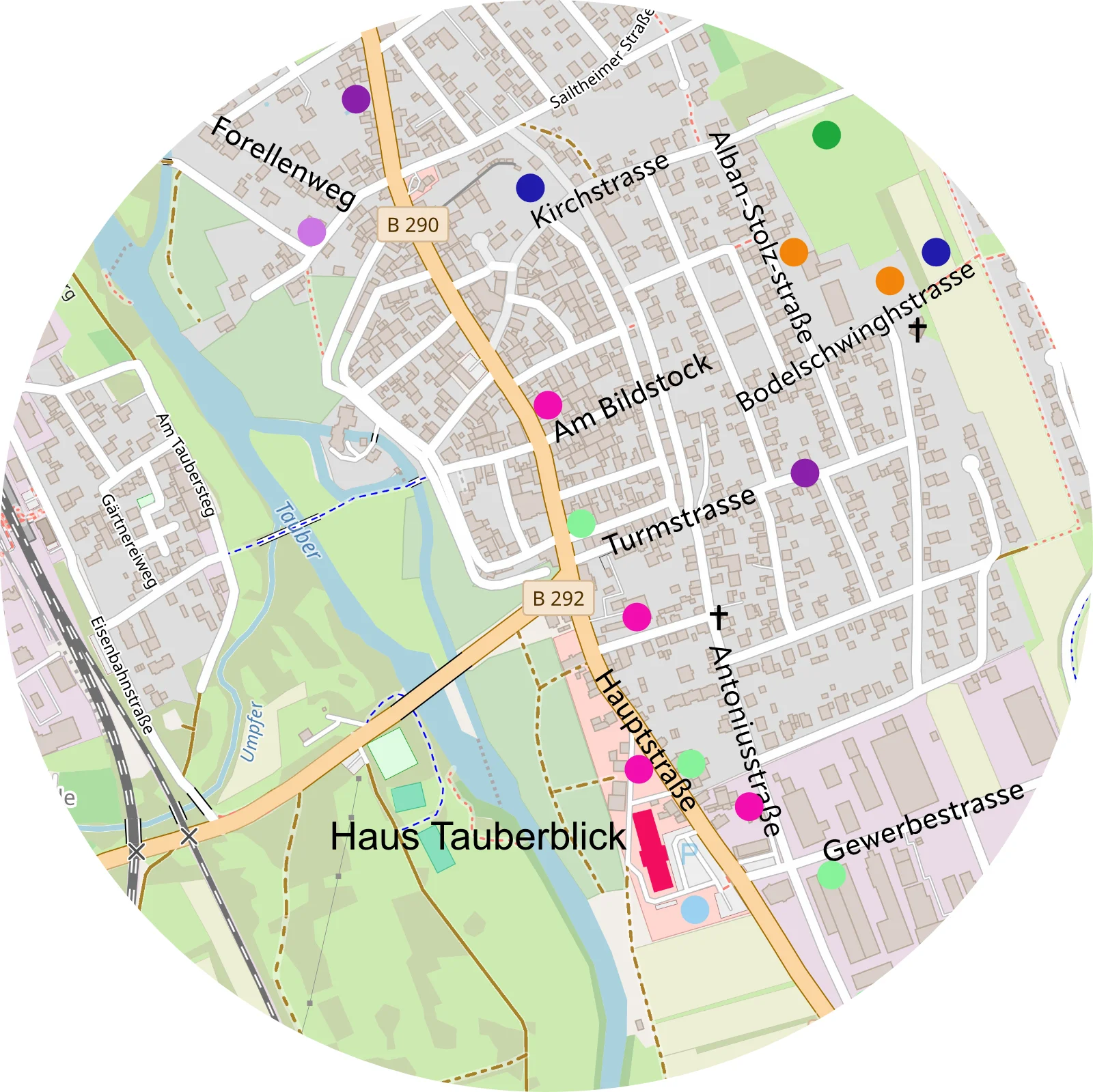Die Lage ist perfekt für ein altersgerechtes Leben. Nahe dem Zentrum sind Einkäufe, Besuche in einem Café, bei einer Apotheke oder Arzt oft zu Fuß oder in wenigen Minuten mit dem PKW zu erreichen. Ebenso bietet sich Ihnen direkt vor der Tür die Möglichkeit Ausflüge ins Grüne, in die sanft hüglige Natur an der Tauber zu machen. Über die Autobahn 81 und regelmäßig verkehrende Zugverbindungen nach Würzburg und Stuttgart rücken auch diese Zentren für Kulturerlebnisse, Theater und Museen in Ihre Nähe.